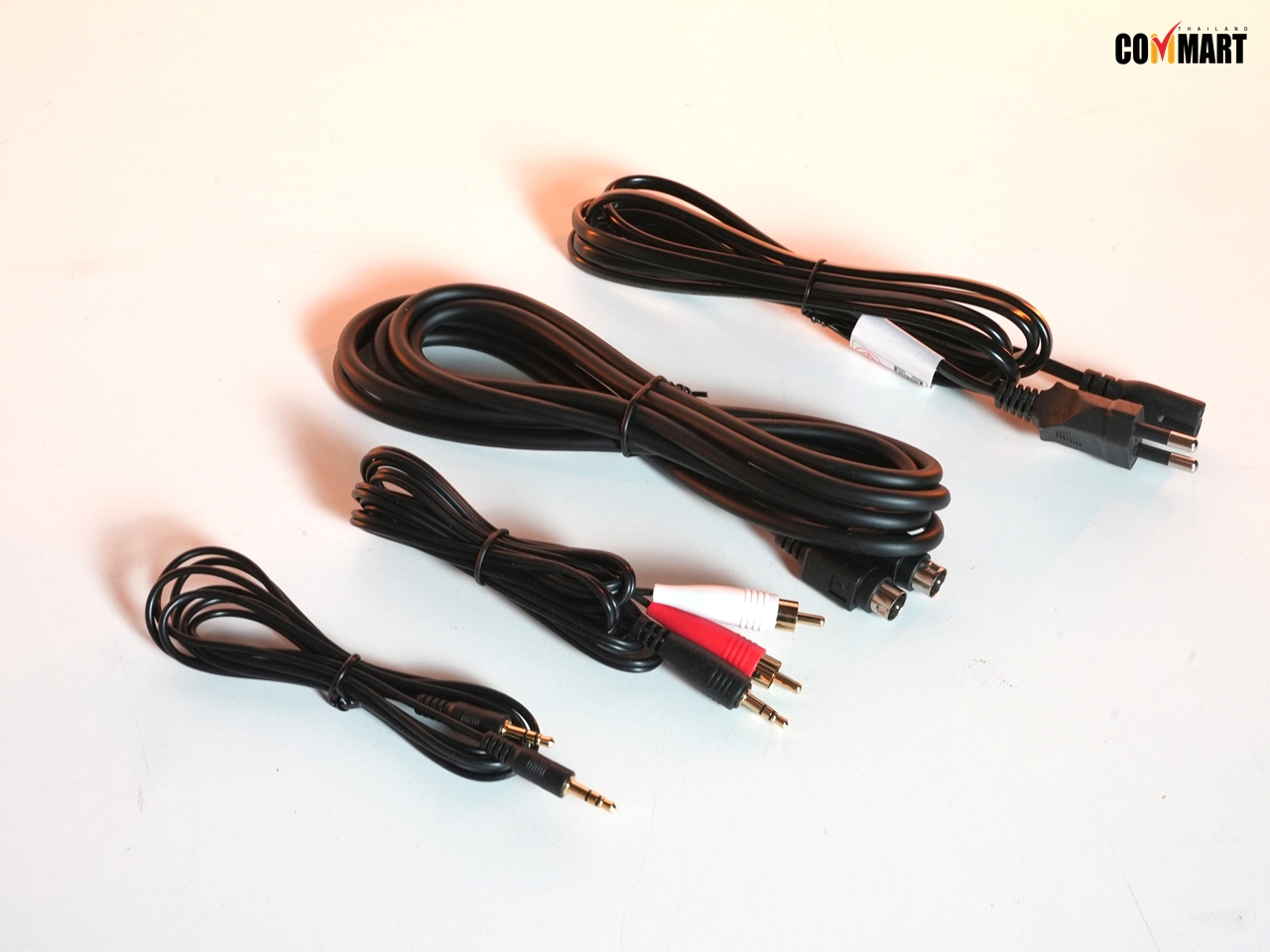 เริ่มจากแกะกล่องก่อนเลย ภายในก็มีตัวลำโพง Edifier MR5 พร้อมสายเชื่อมต่อต่าง ๆ อาทิ Speaker connecting cable สายเชื่อมต่อลำโพงคู่ , 3.5 mm to RCA audio cable สายต่อช่องหูฟังหรือลำโพง 3.5 mm จาก RCA (หรือสายดำแดงที่คุ้นเคย) 3.5 mm to 3.5 mm audio cable สายเชื่อมต่อ 3.5 mm สองหัว และสุดท้าย Power cable สายต่อไฟเลี้ยงตัวลำโพงนั้นเอง จากสายจะเห็นเลยว่าเน้น 3.5 mm ที่เอาไปคอมฯ หรือโน้ตบุ๊กได้สบาย เรียกว่าเป็นลำโพงคอมฯ ก็ยังได้