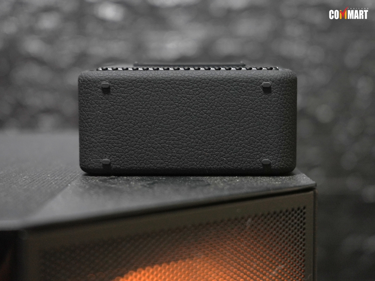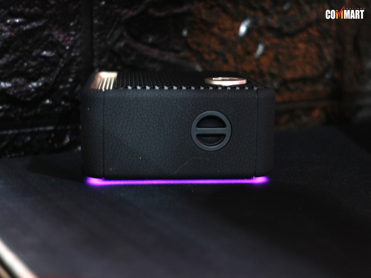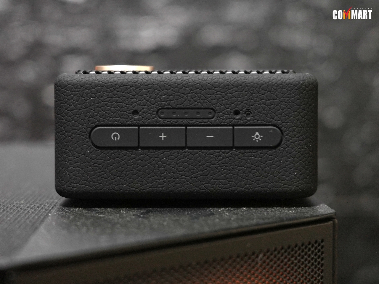 ด้านบนตัวลำโพง ก็มาพร้อมปุ่มควบคุมการเล่นเพลง ซึ่งก็มีปุ่ม Play/Pause กับปุ่มปรับระดับเสียงให้พร้อม และมีปุ่มเปิด/ปิดไฟ RGB ด้วย อนึ่งมีจุดเล็ก ๆ ที่ติดตั้งส่วนไมค์ฯ ด้วยอีก ด้านล่างก็มีขาสำหรับวางตัวลำโพงแนวตั้ง หรือจะวางแนวนอนก็ยังได้