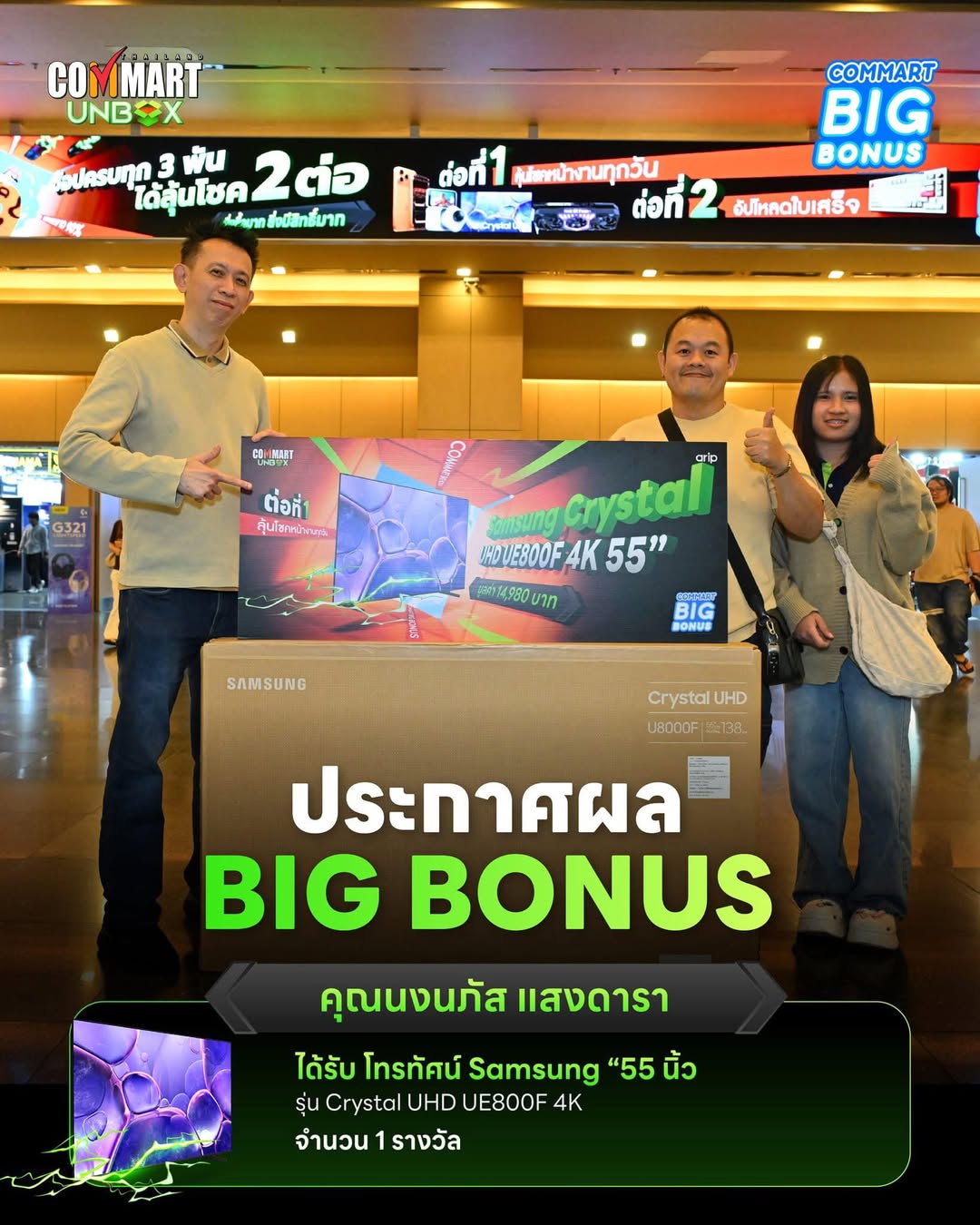 • วันที่ 27 .. 68 โทรทัศน์ Samsung “55 นิ้ว รุ่น Crystal UHD UE800F 4K จำนวน 1 รางวัลมูลค่า 12,305.00 บาท