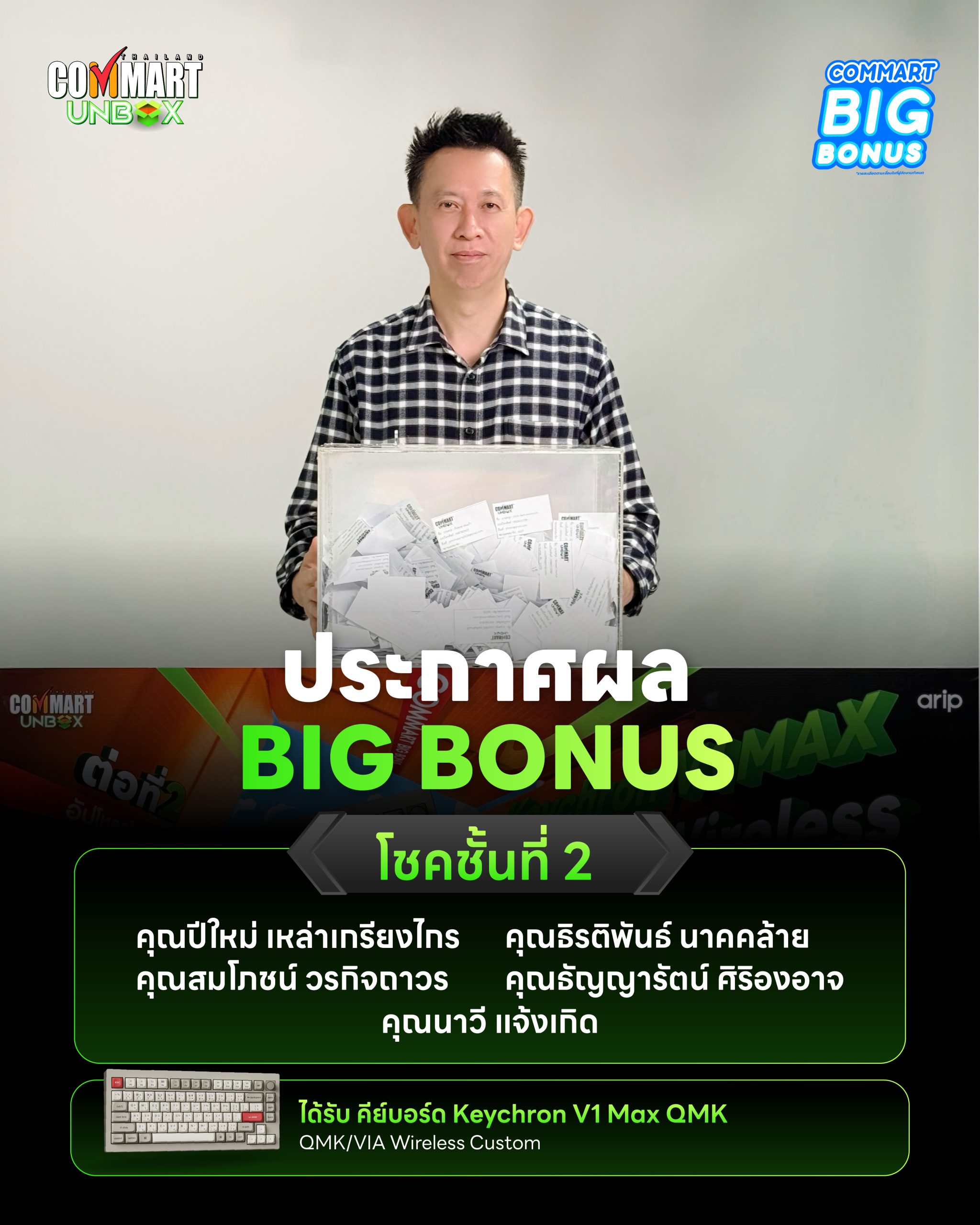 • เพียงอัปโหลดใบเสร็จซื้อสินค้างานงานคอมมาร์ต Unbox ระหว่างวันที่ 27 .. – 3 .. 68 ลุ้นรับฟรี Keyboard Keychron V1 Max QMK/VIA Wireless Custom จำนวน 5 รางวัลๆ ละ 3,450.00 บาท รวมมูลค่า 17,250.00 บาท