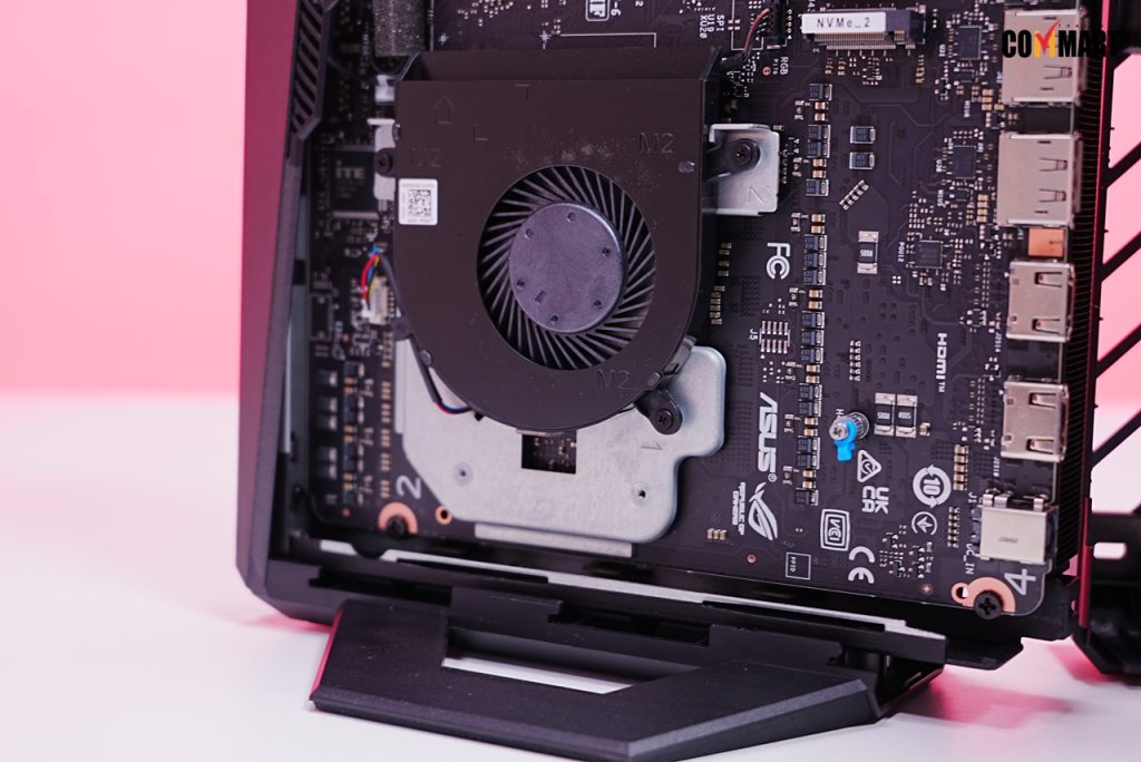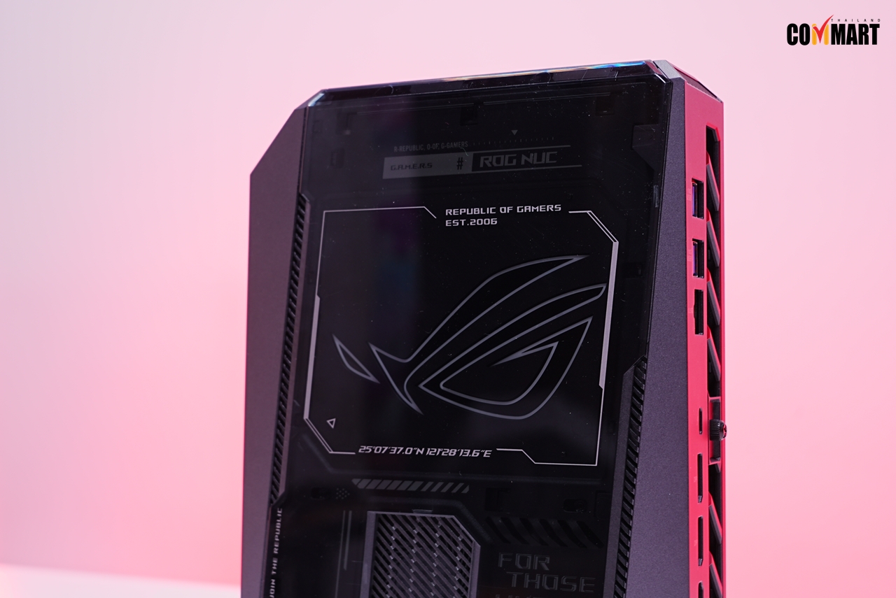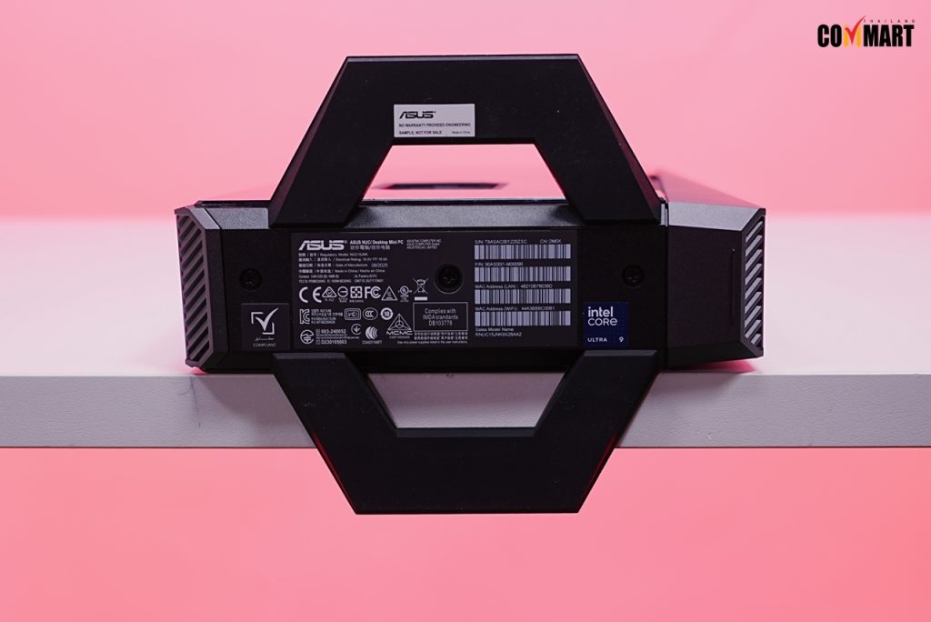 สำหรับตัว ASUS ROG NUC (2025) มาแปลกหน่อยตรงที่ไม่สามารถวางแนวนอนได้แล้ว เนื่องจากส่วนที่เป็นฐานตั้งวางนั้น (โลโก้ Intel Ultra มาอยู่ตรงนี้เอง) มีการขันน็อตแน่นหนา ไม่ได้ถอดเข้าออกง่าย ๆ เหมือนรุ่นก่อนหน้า