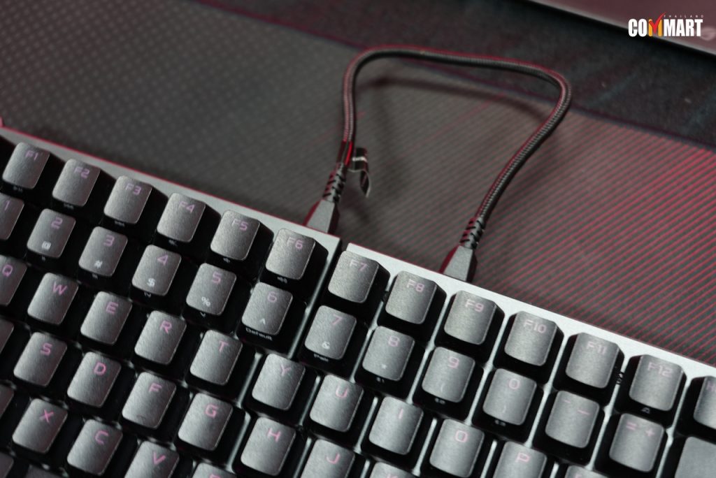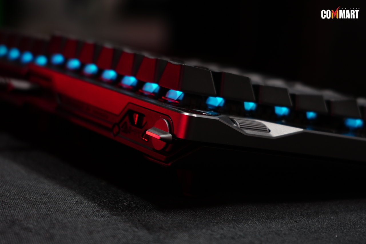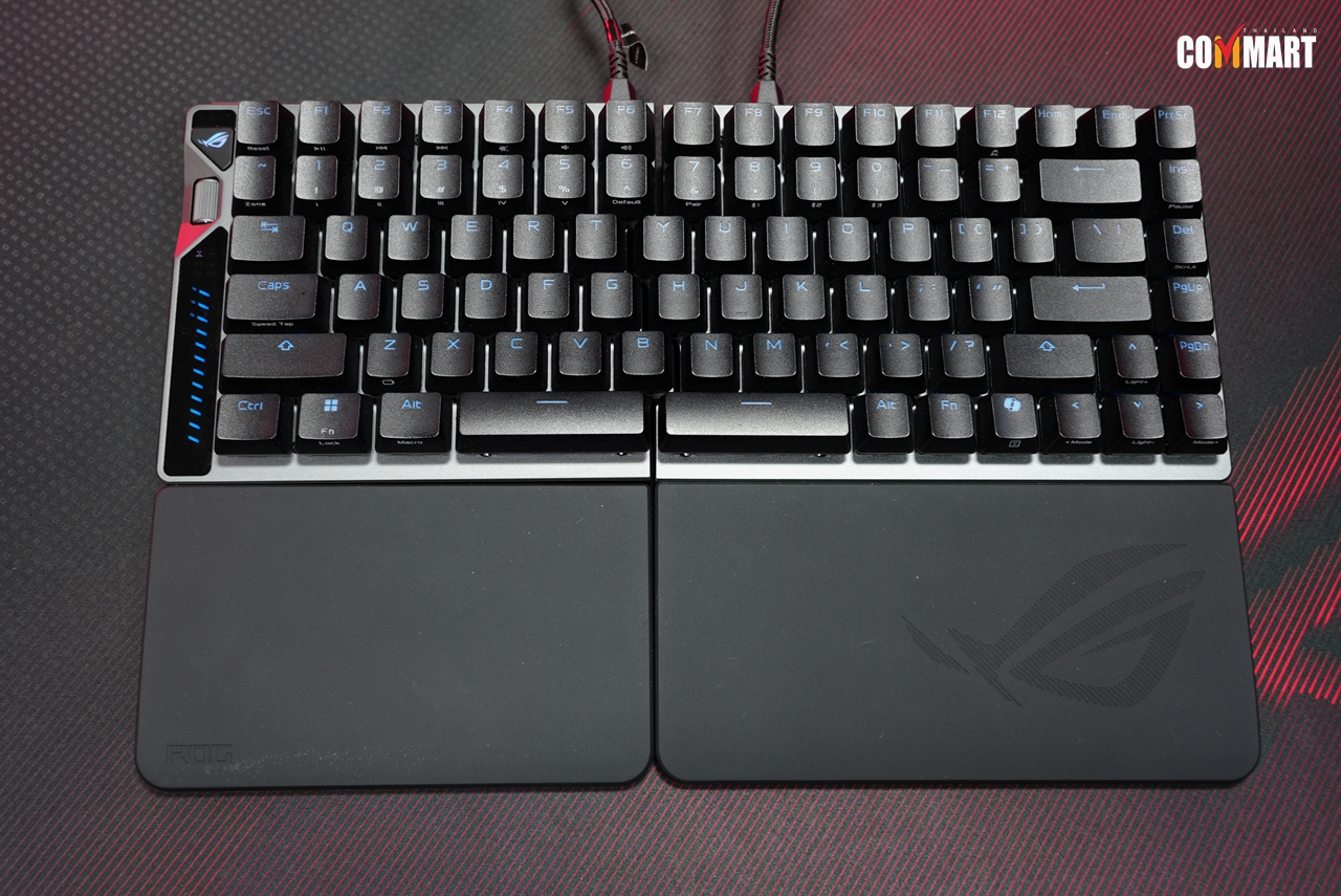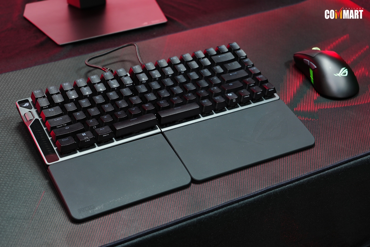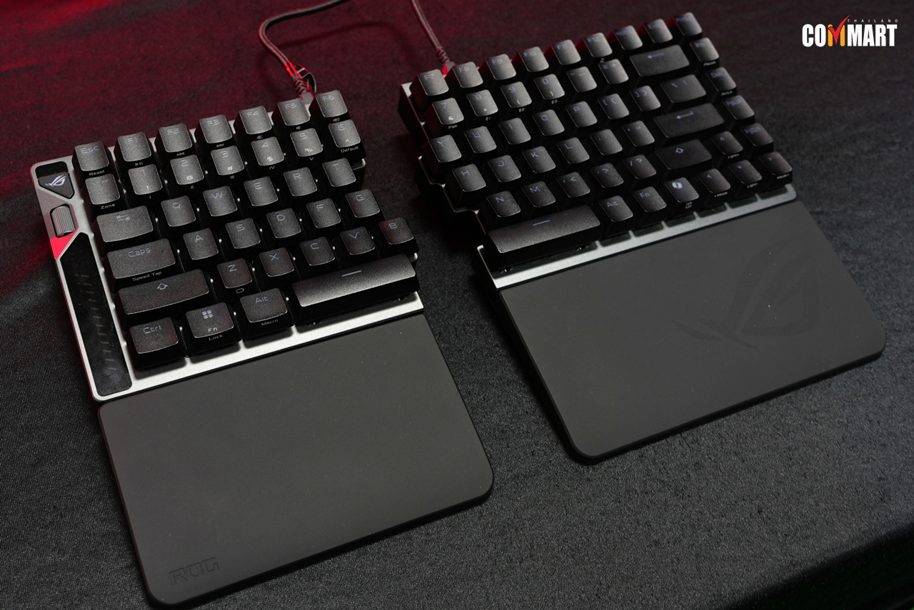 ถัดมาคือ ROG Falcata คีย์บอร์ดเกมมิ่งขนาด 75% ที่สามารถแยกส่วนเป็น 2 ฝั่งได้ โดยยังมาพร้อมสวิตช์แม่เหล็ก ROG HFX V2 ให้สัมผัสการกดได้เป็นเอกลักษณ์ และปรับแต่งการสัมผัส (กดปุ่มติด) ได้ระหว่าง 0.1 – 3.5 มม. และการปรับแต่งขั้นตอนที่แม่นยำได้ถึง 0.01 มม. ทั้งยังมีเซ็นเซอร์ ROG Hall ช่วยให้การเชื่อมต่อไร้สายมีประสิทธิภาพขึ้น และลดสัญญาณรบกวนได้ดี ส่วนดีไซน์ตัวคีย์บอร์ด