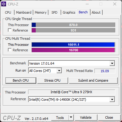 ลองทดสอบความแรงซีพียูเบื้องต้นด้วย CPU-Z เทียบความแรงกับ Intel Core i9-14900K พบมีประสิทธิภาพพอ ๆ กันเลย แต่ Single Thread ของ Core Ultra 9 275 HX แรงน้อยกว่านิดหน่อย