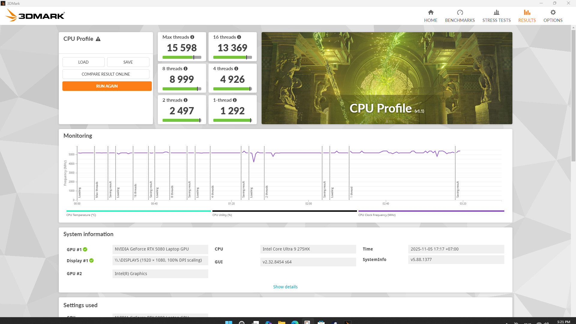 มาถึงส่วน 3D Mark แล้ว ก็ขอทดสอบประสิทธิภาพซีพียูต่อด้วย CPU Profile ของ 3D Mark ตัวซีพียู Intel Core Ultra 9 275HX ก็ได้คะแนน Core/Thread สูงทีเดียว