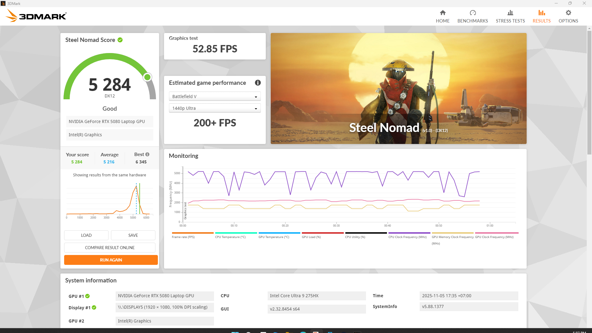 ต่อไปลองวัดประสิทธิภาพกราฟิกขั้นสูงด้วย Steel Nomad ก็ได้คะแนนที่ 5,286