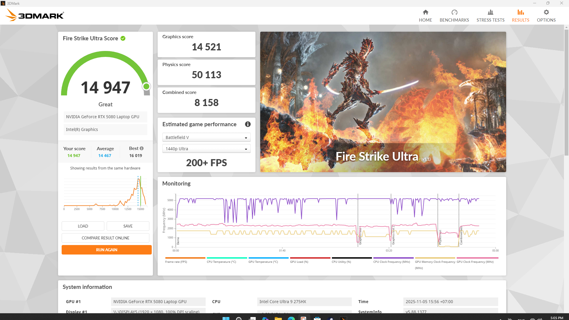 ท้ายนี้กับ Fire Strike Ultra ทดสอบประสิทธิภาพการ์ดจอแบบเน้น ๆ ก็รันภาพกราฟฟิกได้ลื่นไหลทีเดียว ส่วนคะแนนก็ได้ถึง 14,949 คะแนนเข้าไปแล้ว