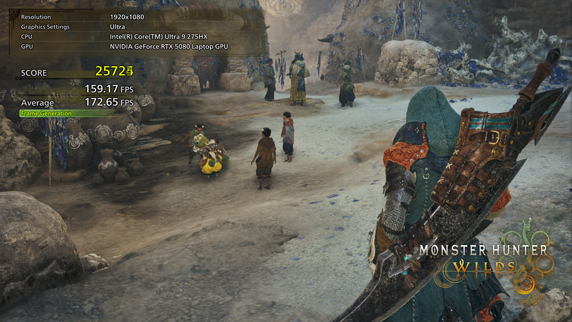 อีกเกมอย่าง Monster Hunter Wilds (Benchmark) ก็ได้เฟรตเฉลี่ยถึง 172 fps ลื่นหัวแตกเลย โดยปรับภาพสุด Ultra ทุกอย่าง กับเปิด DLSS