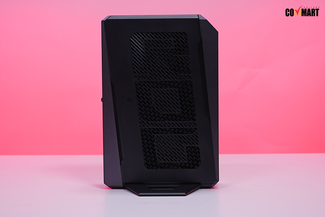 ตัวเครื่องมาพร้อมสีดำด้านทั้งตัว ฝาข้างฝั่งหนึ่งก็มีช่องระบายความร้อนพร้อมโล้โก้ ROG เด่นชัด ส่วนอีกฝั่งก็มีโลโก้ ROG เช่นกัน แต่เพิ่มเติมคือไฟ RGB ตามแบบฉบับของซีรีส์นี้ และสีดำเงาแบบเคลียร์ใส จนเห็นส่วนประกอบภายใน (นิด ๆ) เพิ่มความหล่อเท่ไปอีกแบบ