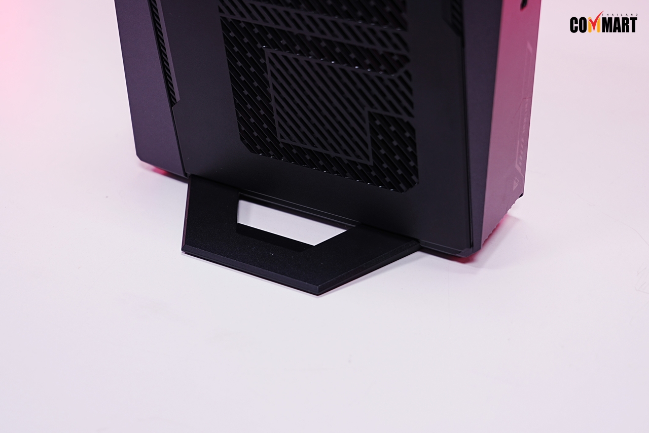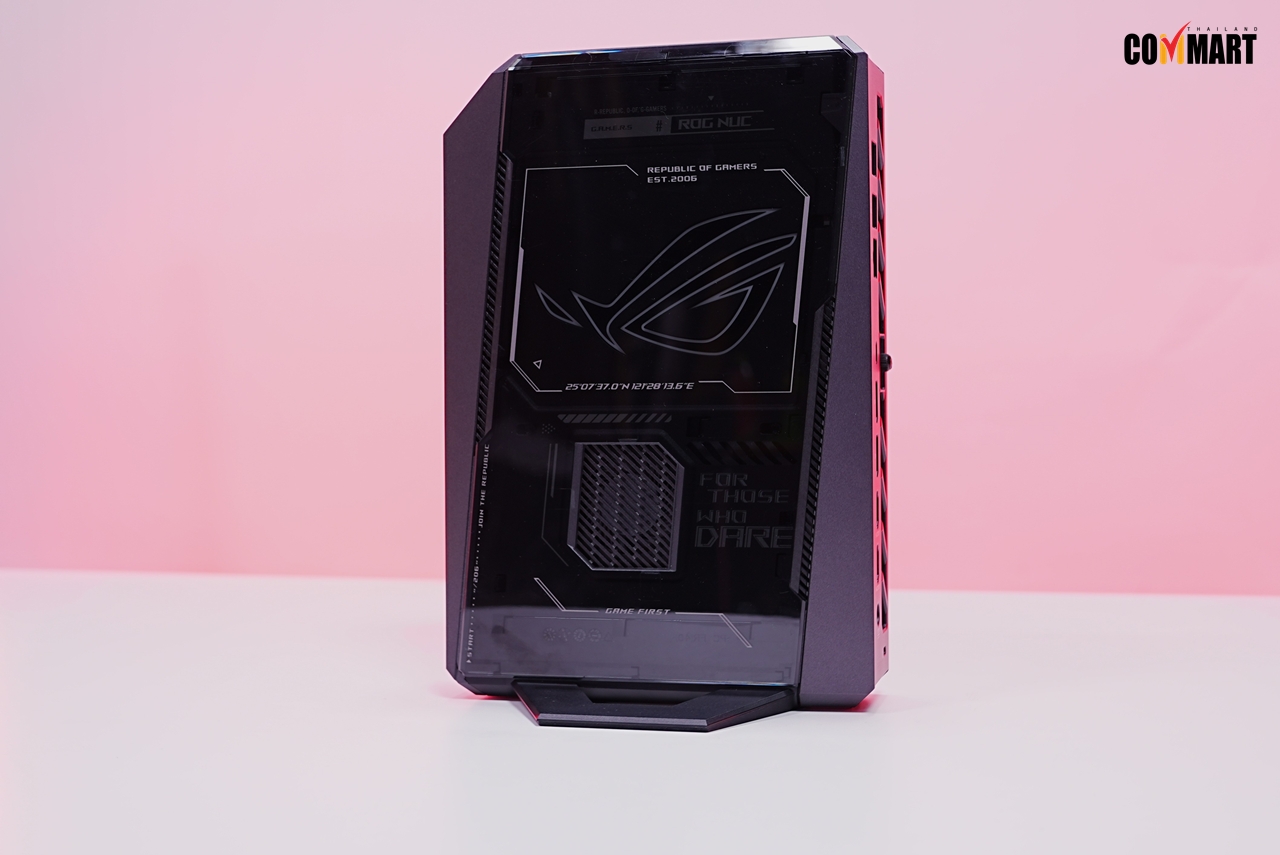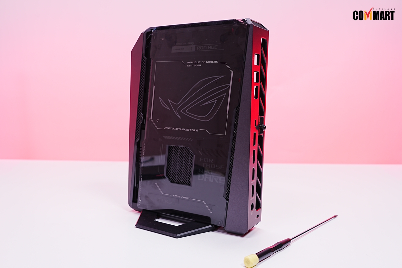 สำหรับตัว ASUS ROG NUC (2025) มาแปลกหน่อยตรงที่ไม่สามารถวางแนวนอนได้แล้ว เนื่องจากส่วนที่เป็นฐานตั้งวางนั้น (โลโก้ Intel Ultra มาอยู่ตรงนี้เอง) มีการขันน็อตแน่นหนา ไม่ได้ถอดเข้าออกง่าย ๆ เหมือนรุ่นก่อนหน้า