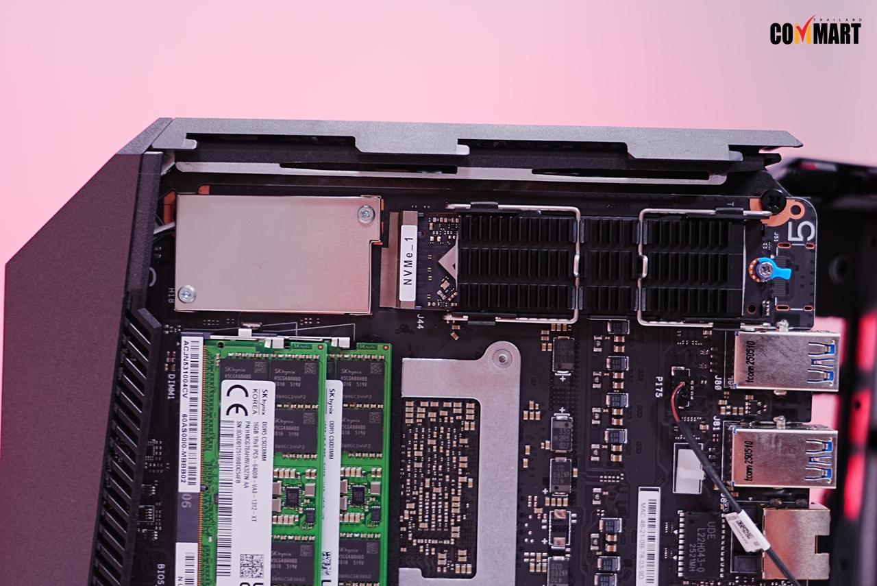 สำหรับการอัปเกรดนั้น ก็สามารถเพิ่มหรือเปลี่ยนส่วนแรม DDR5 แบบ SO-DIMM ได้ โดยเพิ่มความจุได้มากถึง 96GB (ใส่ 48GB x 2) ถัดมาคือช่องใส่ SSD M.2 โดยจะมีใส่ตัว 2TB M.2 2280 NVMe Gen 4 ไว้แล้วหนึ่งตัว (มีใส่ Heatsink ให้ด้วย) แต่ก็มีช่อง M.2 เหลือว่างอีกหนึ่ง สามารถหา SSD M.2 มาใส่เพิ่มได้เลย