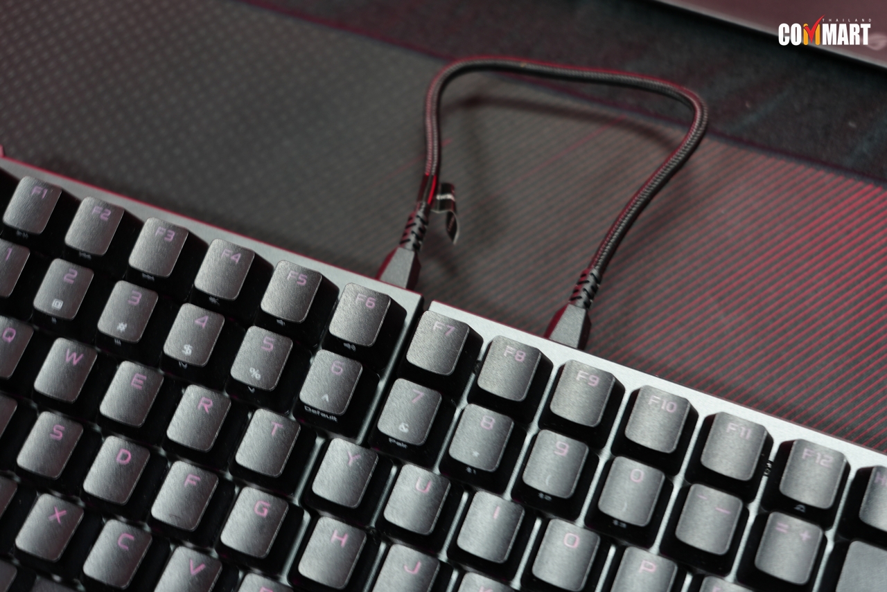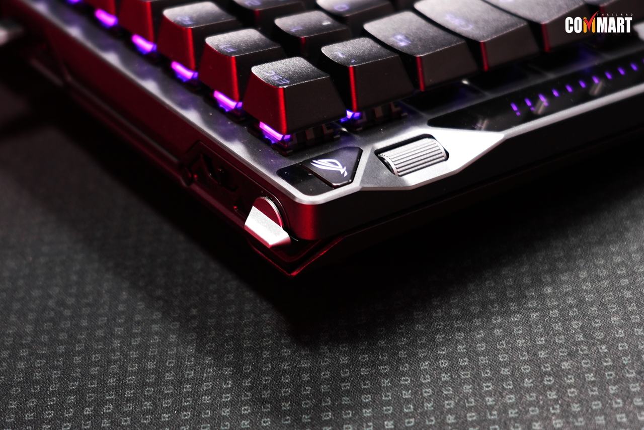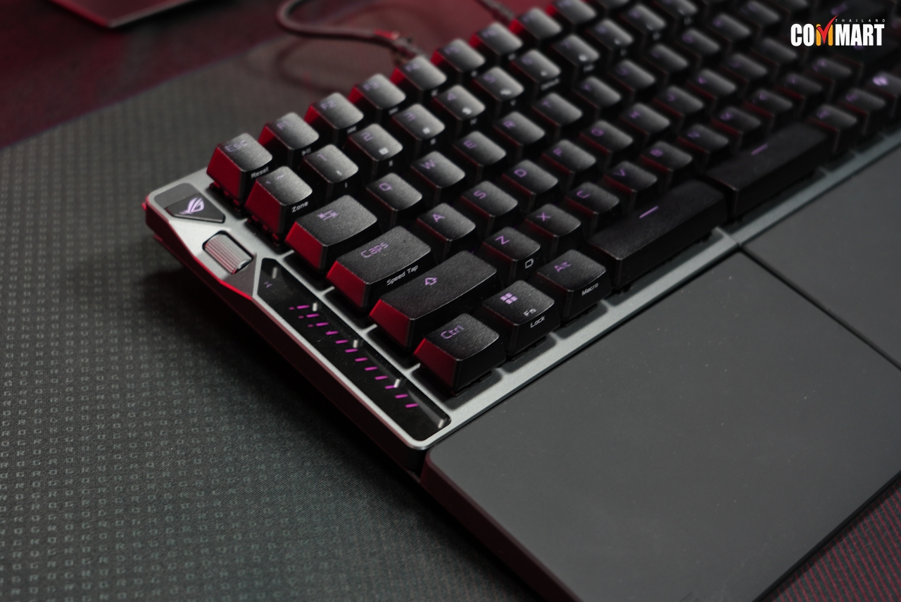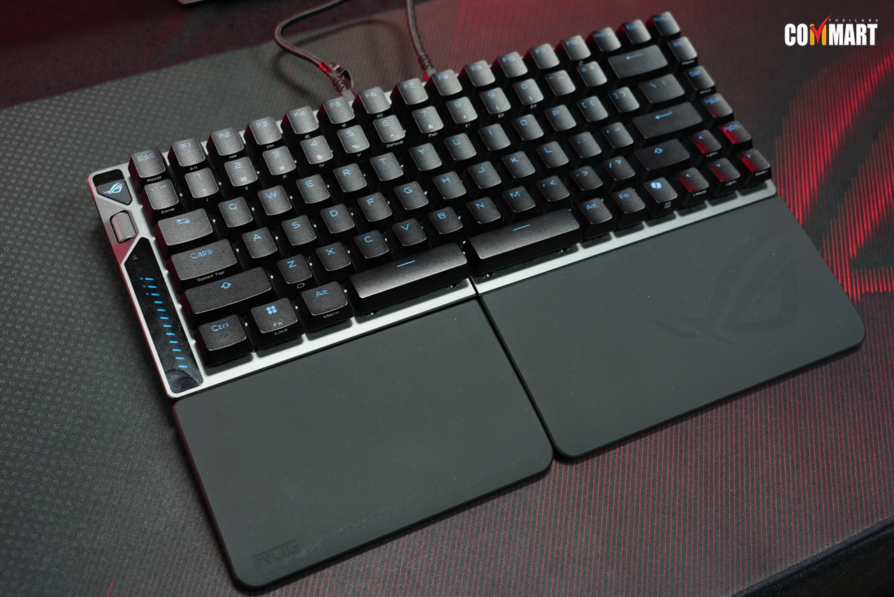 ถัดมาคือ ROG Falcata คีย์บอร์ดเกมมิ่งขนาด 75% ที่สามารถแยกส่วนเป็น 2 ฝั่งได้ โดยยังมาพร้อมสวิตช์แม่เหล็ก ROG HFX V2 ให้สัมผัสการกดได้เป็นเอกลักษณ์ และปรับแต่งการสัมผัส (กดปุ่มติด) ได้ระหว่าง 0.1 – 3.5 มม. และการปรับแต่งขั้นตอนที่แม่นยำได้ถึง 0.01 มม. ทั้งยังมีเซ็นเซอร์ ROG Hall ช่วยให้การเชื่อมต่อไร้สายมีประสิทธิภาพขึ้น และลดสัญญาณรบกวนได้ดี ส่วนดีไซน์ตัวคีย์บอร์ด