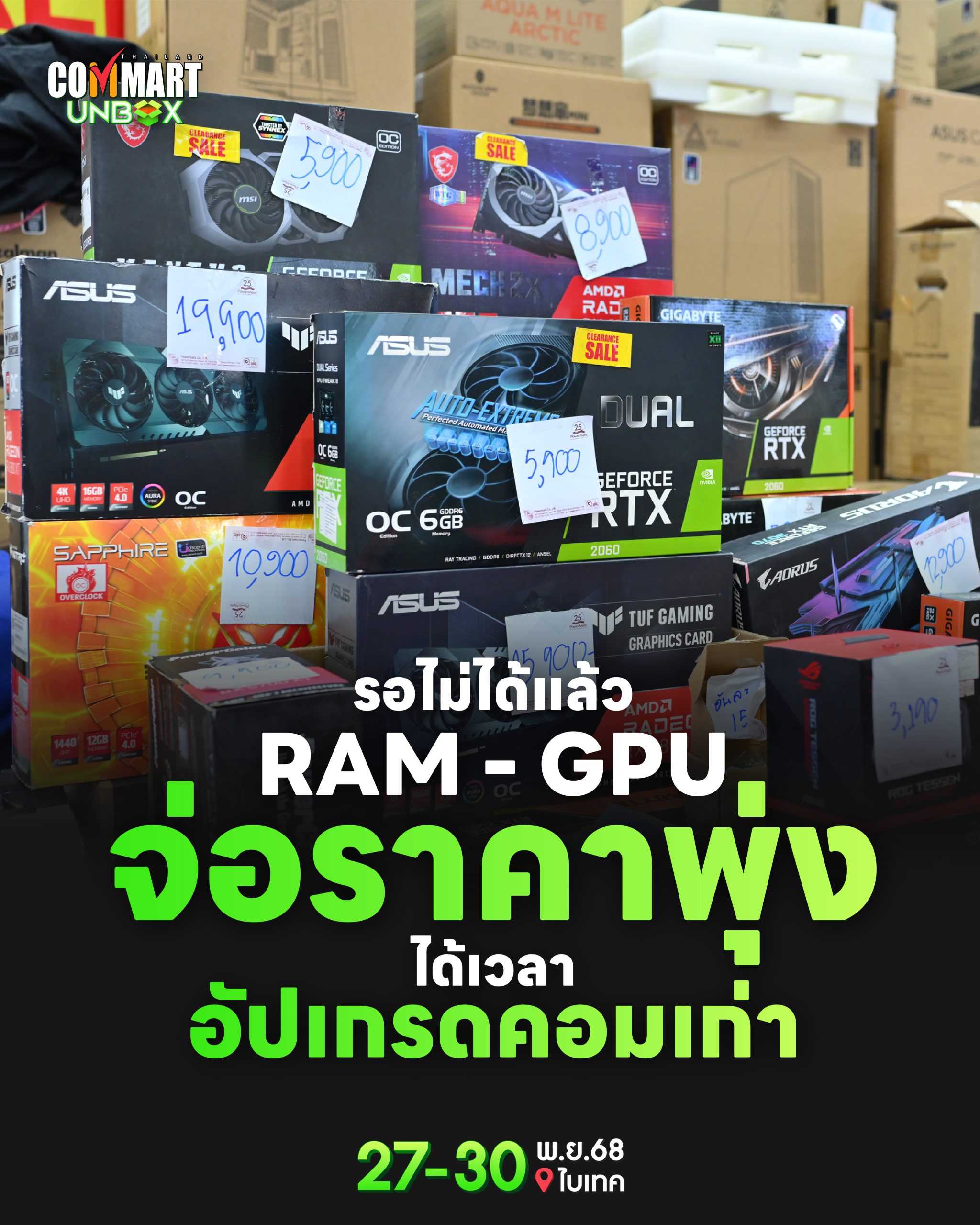 หากใครกำลังลังเลว่าจะอัปเกรดคอม หรือรอโปรโมชั่นลดราคาหรือคิดว่าซื้อปีหน้าก็ได้ บอกเลยว่า วันนั้นการ์ดจะขึ้นราคาอีก… และแนวโน้มที่เรา จะเห็นราคาลดลง ในเร็วก็เป็นไปได้ยาก มีแต่จะคงที่หรือพุ่งขึ้นเท่านั้น หากใครมีแผนจะซื้อคอมใหม่อยู่แล้ว นี่คือจังหวะที่ดีที่สุดครับ เจอกัน Commart Unbox 27-30 พฤศจิกายนนี้ ที่ ไบเทค บางนา เข้าฟรี