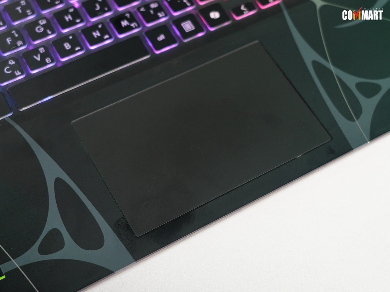 บริเวณคียบอร์ชดจะเห็นส่วนที่ใช้วัสดุโปร่งใส เห็นส่วนระบบระบายความร้อนของตัวเครื่องแบบชัดเจน เพิ่มความเด่นให้กับตัว MSI Cyborg 15 ได้พอควรเลย