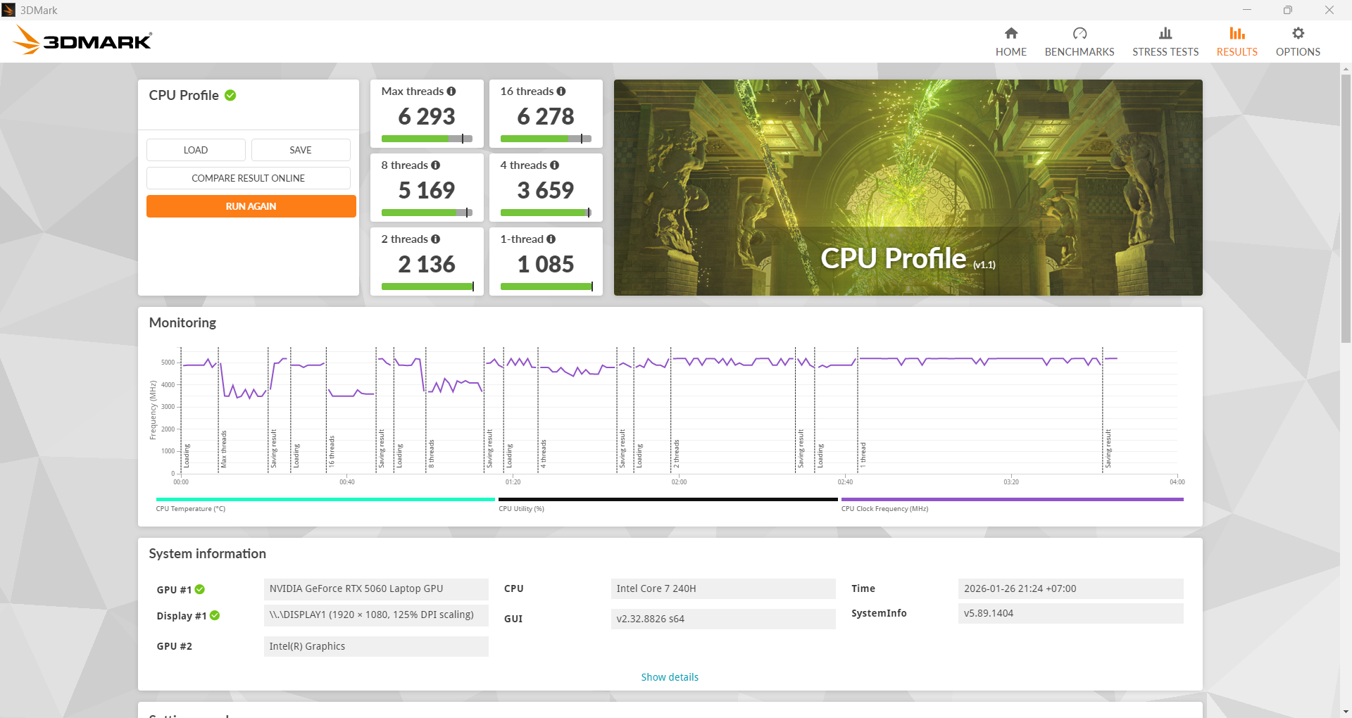 ต่อด้วย CPU Prifile ก็ได้คะแนนไป 6,293 สำหรับ Max threads และ 6,278 สำหรับ 16 threads