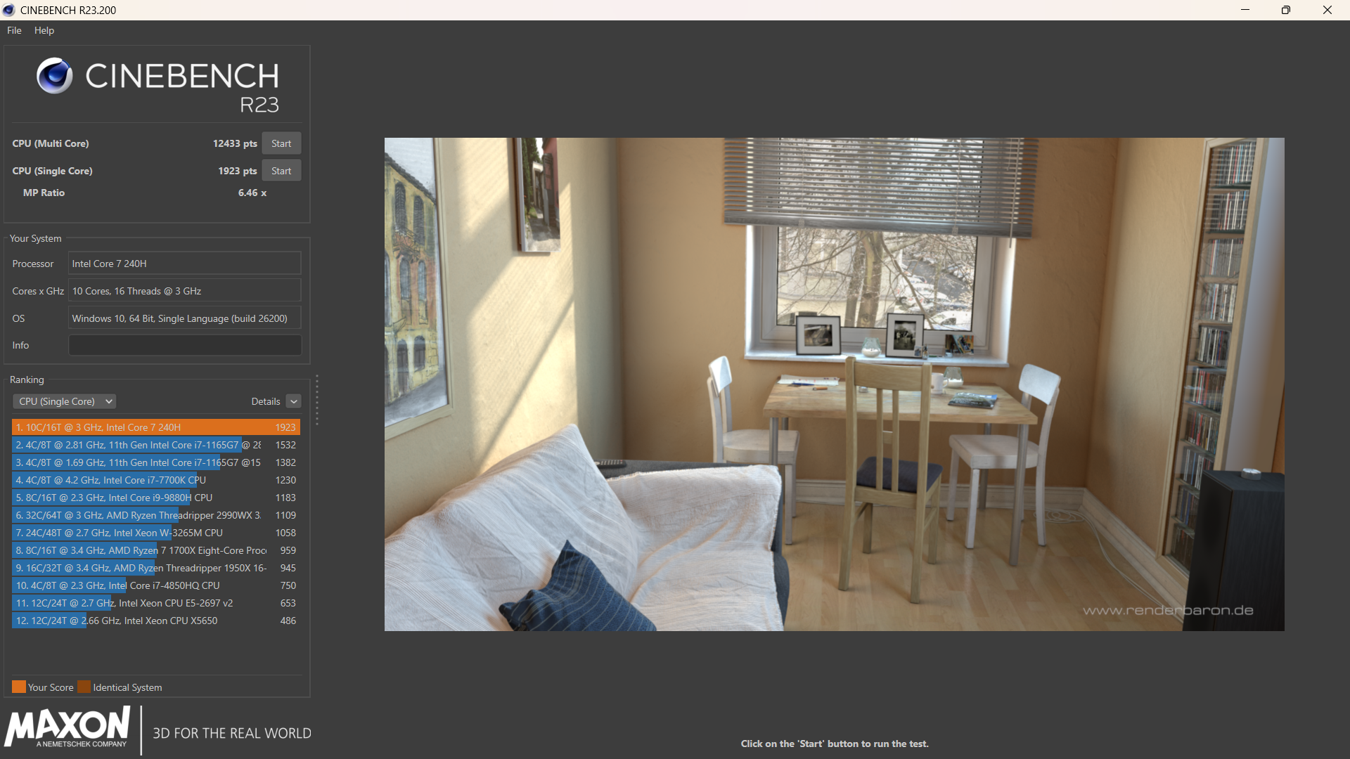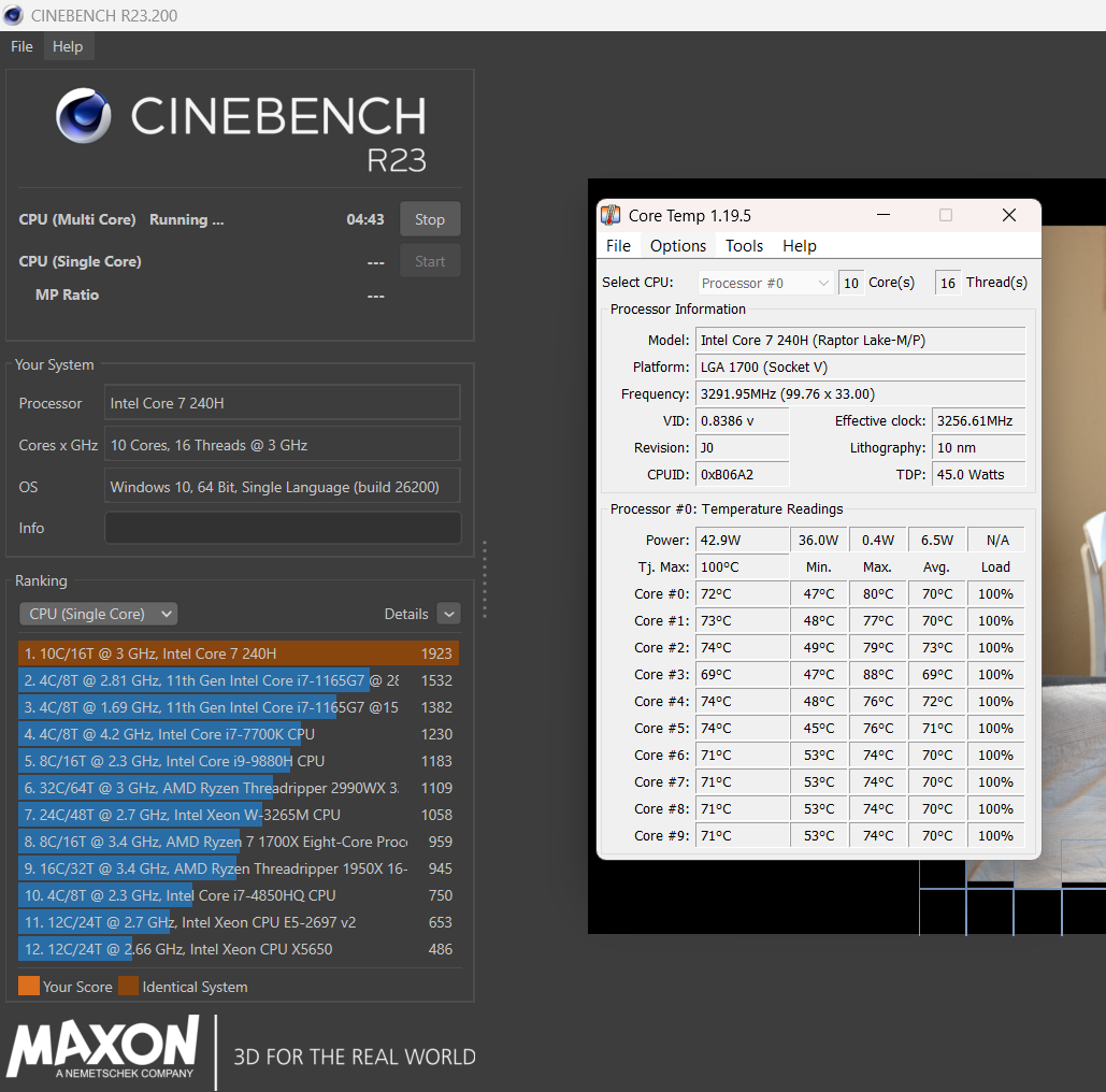 ประเดิมด้วย Cinebench R23 เจ้าเก่า ก็ได้คะแนน CPU แบบ Muti Core ไป 12433 pts และ Single Core ที่ 1923 pts สังเกตได้เลยว่าคะแนน Single Core เกือบเท่ากับ Intel Core i9 14900HX ที่ได้คะแนนไป 2029 เลย แต่ด้วยจำนวน Core/Thead ที่น้อยกว่าก็ตามสภาพ แต่ก็จัดเป็นซีพียูที่แรงพอประมาณแล้วสำหรับ Intel Core i7 240H