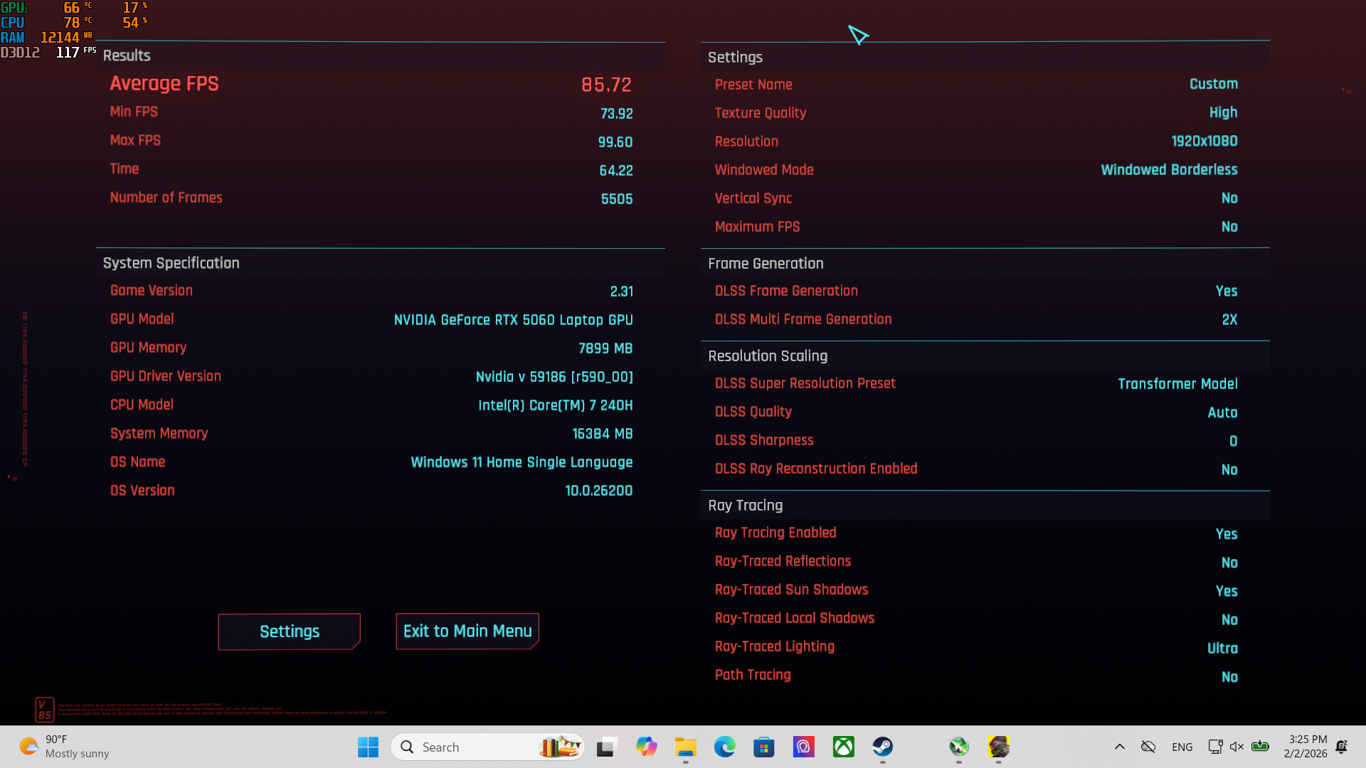 ต่อด้วยเกมกินสเปกเจ้าเก่าอย่าง Cyberpunk 2077 ที่แม้จะวางขายมานานแล้ว แต่ก็ยังกินสเปกขั้นโหดเหมือนเคย โดยเฉพาะการเปิดใช้ Ray Tracing แต่สำหรับตัว MSI Cyborg 15 B2RW ก็ยังเล่นได้แบบลื่นไหลระดับ 80 fps โดยลองปรับภาพพร้อมเปิด Ray Tracing ขั้นสุด บนความละเอียด Full HD ก็ยังเล่นได้ลื่น โดยมี DLSS แบบ “Auto” กับ Frame Generation แบบ “2x” ช่วย ภาพก็ยังคมเช่นเคย