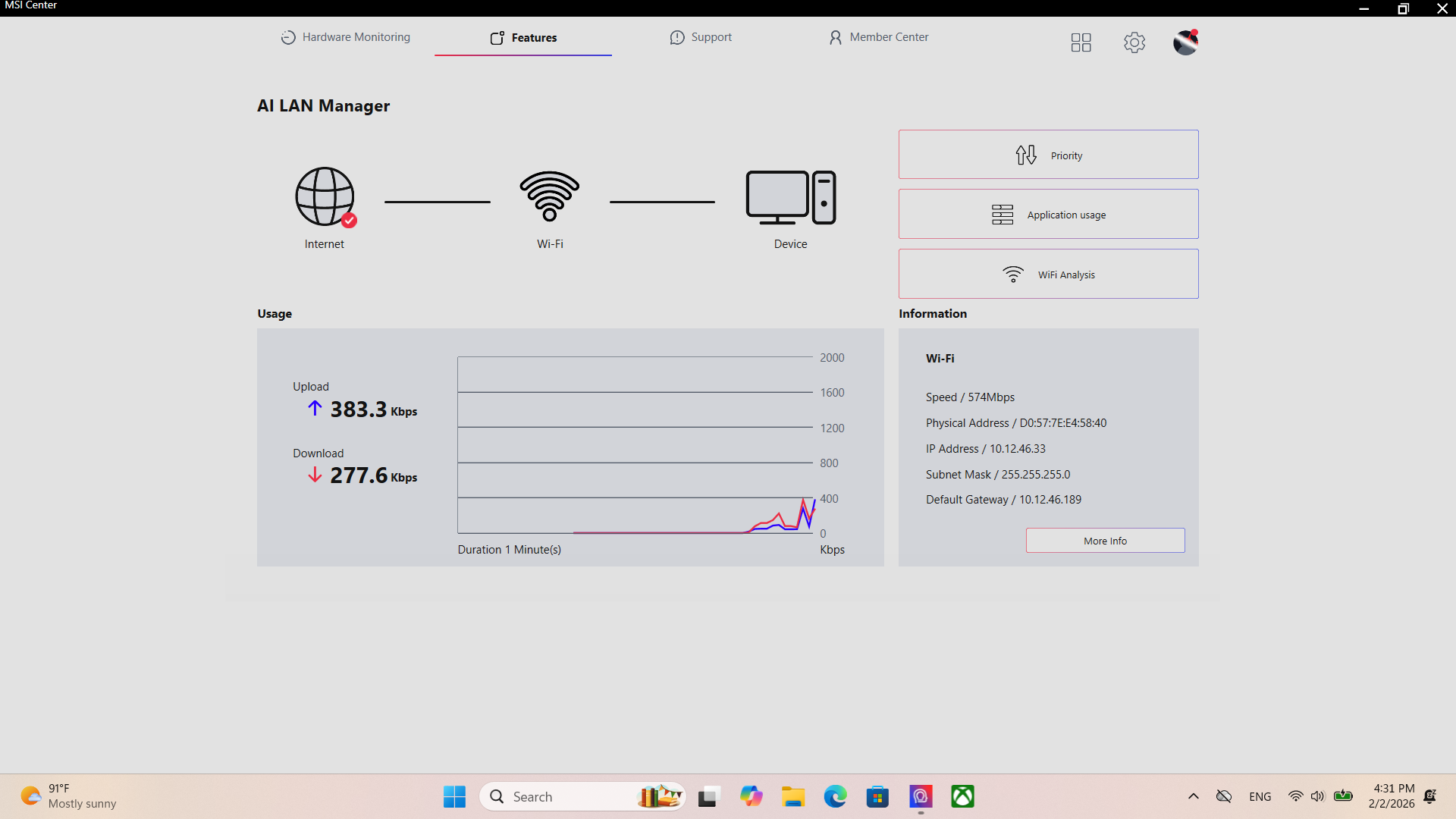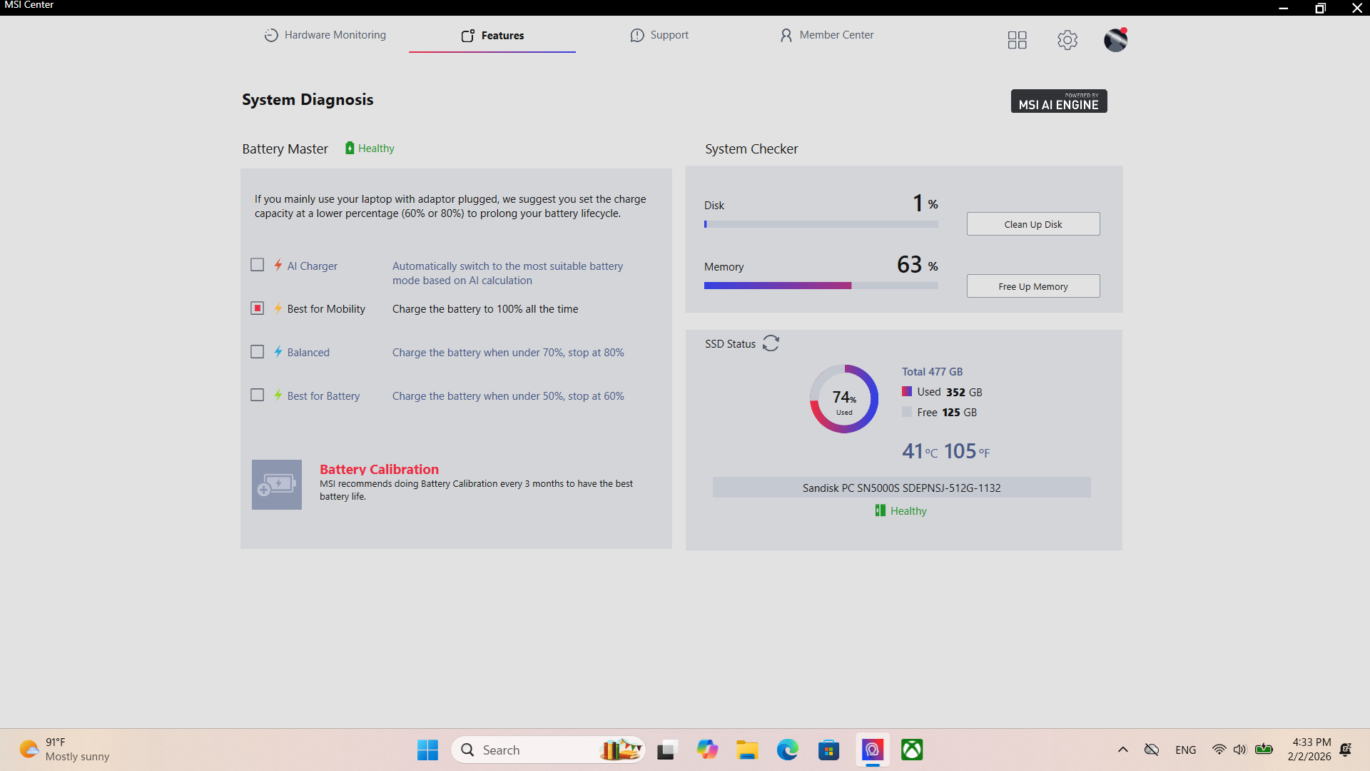 นอกจากส่วนนี้แล้ว ตัว MSI AI Engine ยังแฝงในส่วนตั้งค่าอื่น ๆ ด้วย เช่น วิเคราะห์แบตฯ วิเคราะห์การเชื่อมต่ออินเทอร์เน็ต และอีกมากมาย ช่วยให้ใช้งานตัว MSI Cyborg 15 B2RW ได้แบบหายห่วง