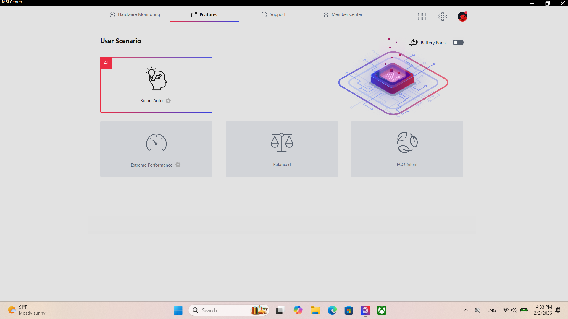 หากใครไม่อยากปรับแต่งการทำงานตัวเครื่องบ่อย ๆ ก็สามารถปล่อยให้ MSI AI Engine หรือระบบ AI ส่งตรงจาก MSI ช่วยปรับแทนได้ ซึ่งเปิดใช้งานได้ผ่าน MSI Center ในหน้าตั้งค่า User Scenario แล้วเลือกโหมด “Smart Auto” ได้เลย ตัวเครื่องปรับแต่งการทำงานตามความเหมาะสม ว่าจะประหยัดแบตฯ หรือดันประสิทธิภาพเต็มที่ ไม่ก็โหมด Balanced ให้เอง