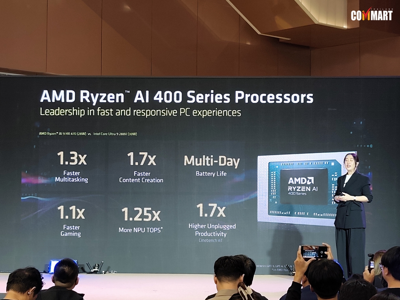 สำหรับชิป Ryzen AI 400 Series ทาง AMD Thailand เผยปประสิทธิภาพเด่นเลยคือ AI ที่รอบนี้มีชิป NPU ช่วยประมวลผล AI ได้แรงกว่า 50 TOPS ทำให้สามารถรัน AI ได้ในตัว โดยไม่ต้องพึ่งอินเทอร์เน็ต ไม่ต้องพึ่ง Cloud ทำให้ใช้งาน Generative AI ได้รวดเร็ว ปลอดภัย และส่วนตัว