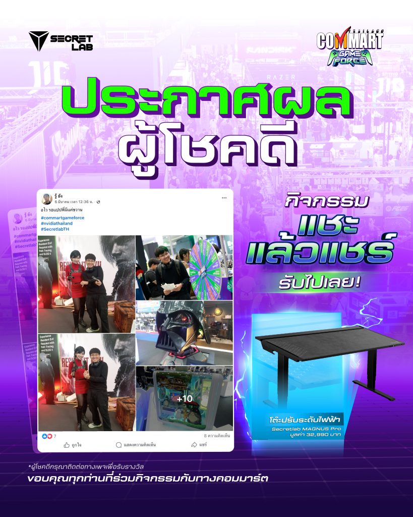 ได้รับ “โต๊ะปรับระดับไฟฟ้า Secretlab MAGNUS Pro” 1 รางวัล กลับบ้านไปฟรี ๆ สปอนเซอร์ใจดี จัดให้ เพียงโพสต์รูปตัวเองมาเดินในงาน ตั้งค่าเป็นสาธารณะ อย่าลืมใส่แท็ก
